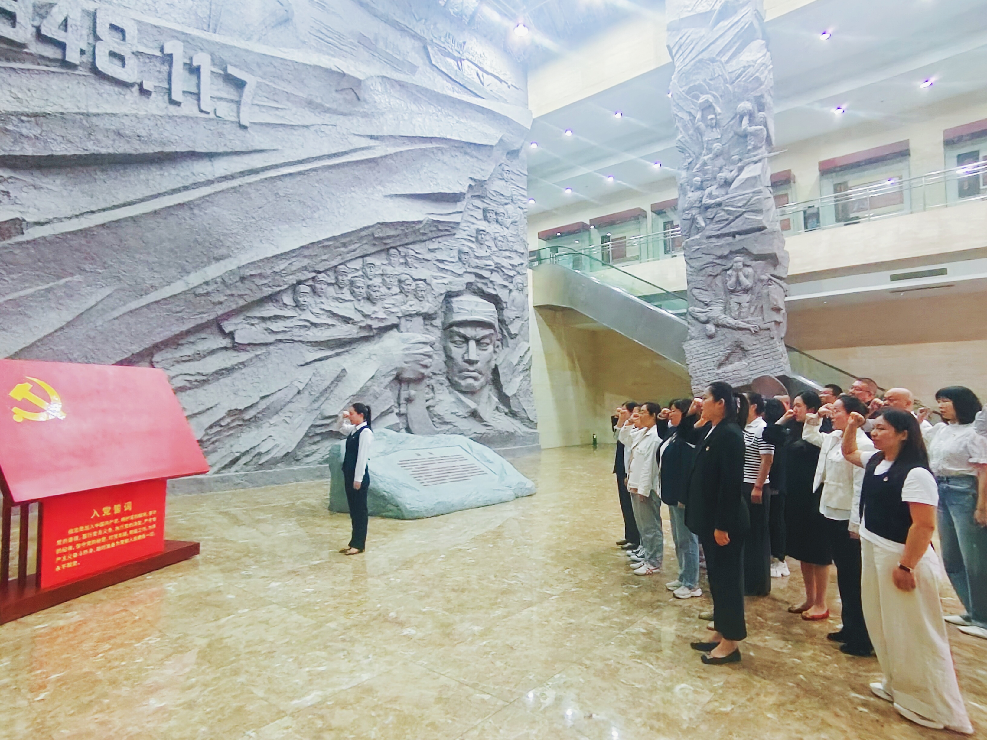 參觀(guān)接近尾聲,全體黨員在紀念館內的黨旗前整齊列隊,舉起右拳莊嚴宣誓,重溫入黨誓詞?!拔抑驹讣尤胫袊伯a(chǎn)黨,擁護黨的綱領(lǐng),遵守黨的章程……”鏗鏘有力的誓言回蕩在展廳內,不僅是對入黨初心的再次叩問(wèn),更是對傳承紅色精神、踐行使命擔當的鄭重承諾。