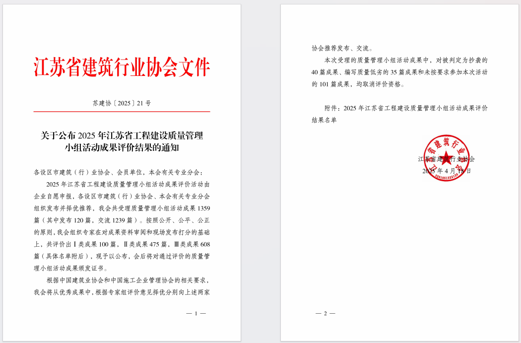 近日,江蘇省建筑行業(yè)協(xié)會(huì )公布2025年江蘇省工程建設質(zhì)量管理小組活動(dòng)成果評價(jià)結果,海建公司“只爭朝夕”QC小組、“瀛洲南路”QC小組憑借成果《提高鋼筋混凝土路面平整度驗收合格率》及《提高橋梁花瓶墩鋼筋保護層合格率》,在眾多參賽小組中脫穎而出,分別榮獲二類(lèi)、三類(lèi)成果獎。
