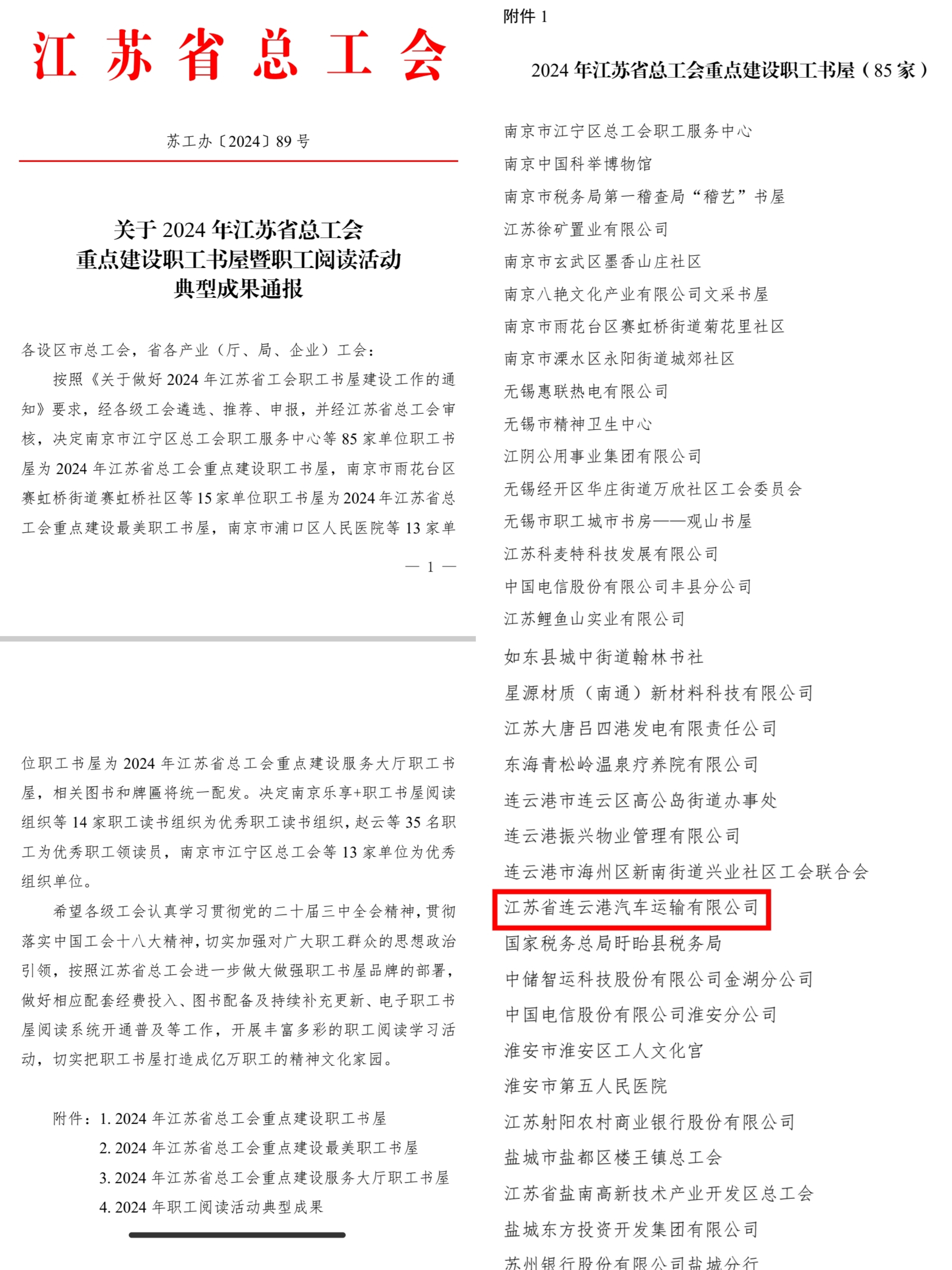 ,江蘇省總工會(huì )傳來(lái)喜訊,連云港汽車(chē)運輸有限公司職工書(shū)屋榮獲2024年度江蘇省總工會(huì )重點(diǎn)建設職工書(shū)屋的稱(chēng)號。
