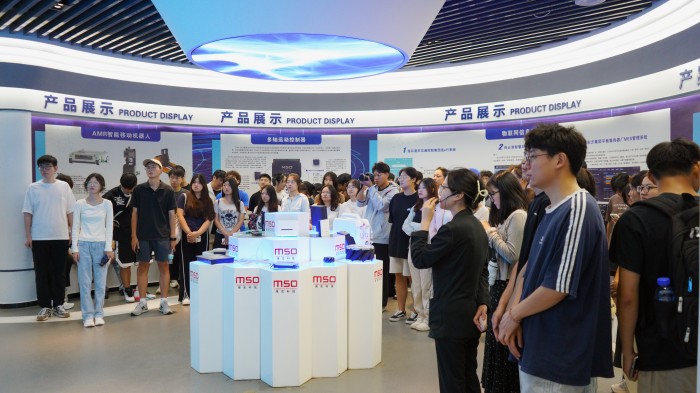 大學(xué)生們首先參觀(guān)了海宏科技展廳,工作人員以展廳背景墻上的十二個(gè)字“智能改變世界 創(chuàng )新引領(lǐng)未來(lái)”為切入點(diǎn),逐一介紹了公司的發(fā)展歷程、主要產(chǎn)品、工業(yè)物聯(lián)網(wǎng)及移動(dòng)機器人、智能制造、高速數控凹版印花等內容。學(xué)子們紛紛圍繞在展品周?chē)?,認真聆聽(tīng)講解,并不時(shí)提出自己的疑問(wèn)和見(jiàn)解,與講解員進(jìn)行熱烈的互動(dòng)。有的同學(xué)圍繞自己的學(xué)習專(zhuān)業(yè)和對智能制造行業(yè)的認知與工作人員積極交流,就企業(yè)對大學(xué)生的專(zhuān)業(yè)需求,以及未來(lái)的學(xué)習成長(cháng)、就業(yè)規劃等問(wèn)題有了更深刻地理解。