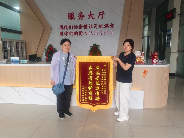 家住海州區華聯(lián)附近的市民徐女士,更是特意制作了一面寫(xiě)有“風(fēng)雨無(wú)阻送考路,感恩有您護前程”的錦旗,親自送到汽服公司出租汽車(chē)事業(yè)部,以此表達對“雷鋒的士”車(chē)隊隊長(cháng)黃仁杰師傅的深深謝意。徐女士回憶道,她是通過(guò)蒼梧晚報看到了愛(ài)心送考服務(wù)的廣告,抱著(zhù)試試看的心態(tài)為二兒子小于報名了一對一點(diǎn)對點(diǎn)送考服務(wù)。沒(méi)想到,對接的黃仁杰師傅讓她十分感動(dòng)。黃師傅提前兩天就與她仔細對接送考路線(xiàn),反復確認每一個(gè)細節,確保萬(wàn)無(wú)一失。送考的三天里,黃師傅每次都提前到達約定地點(diǎn),車(chē)內干凈整潔,一塵不染。高考期間天氣炎熱,黃師傅不僅準時(shí)出現在考場(chǎng)外,還貼心地為考生準備了礦泉水,讓徐女士一家感激不已。