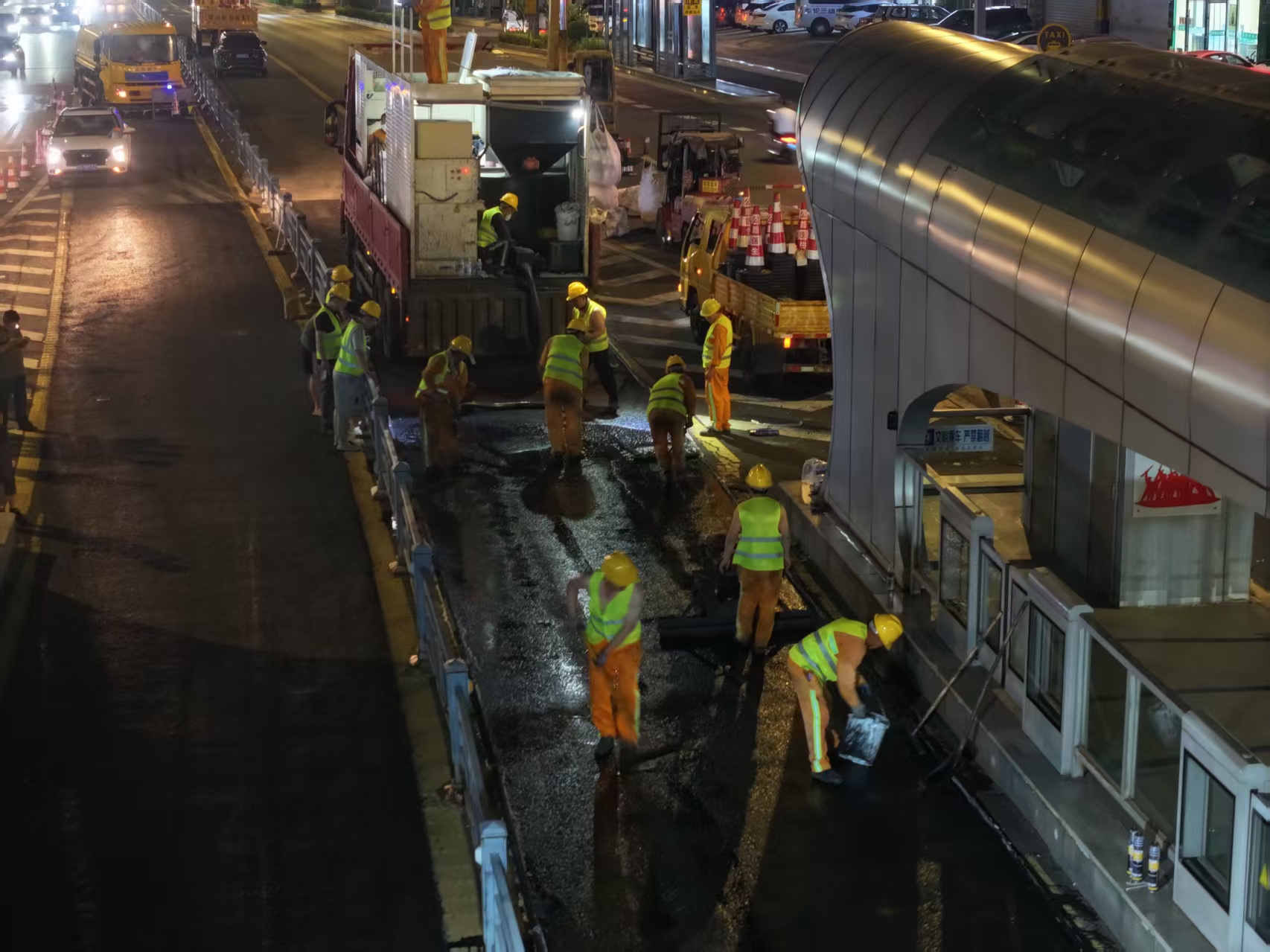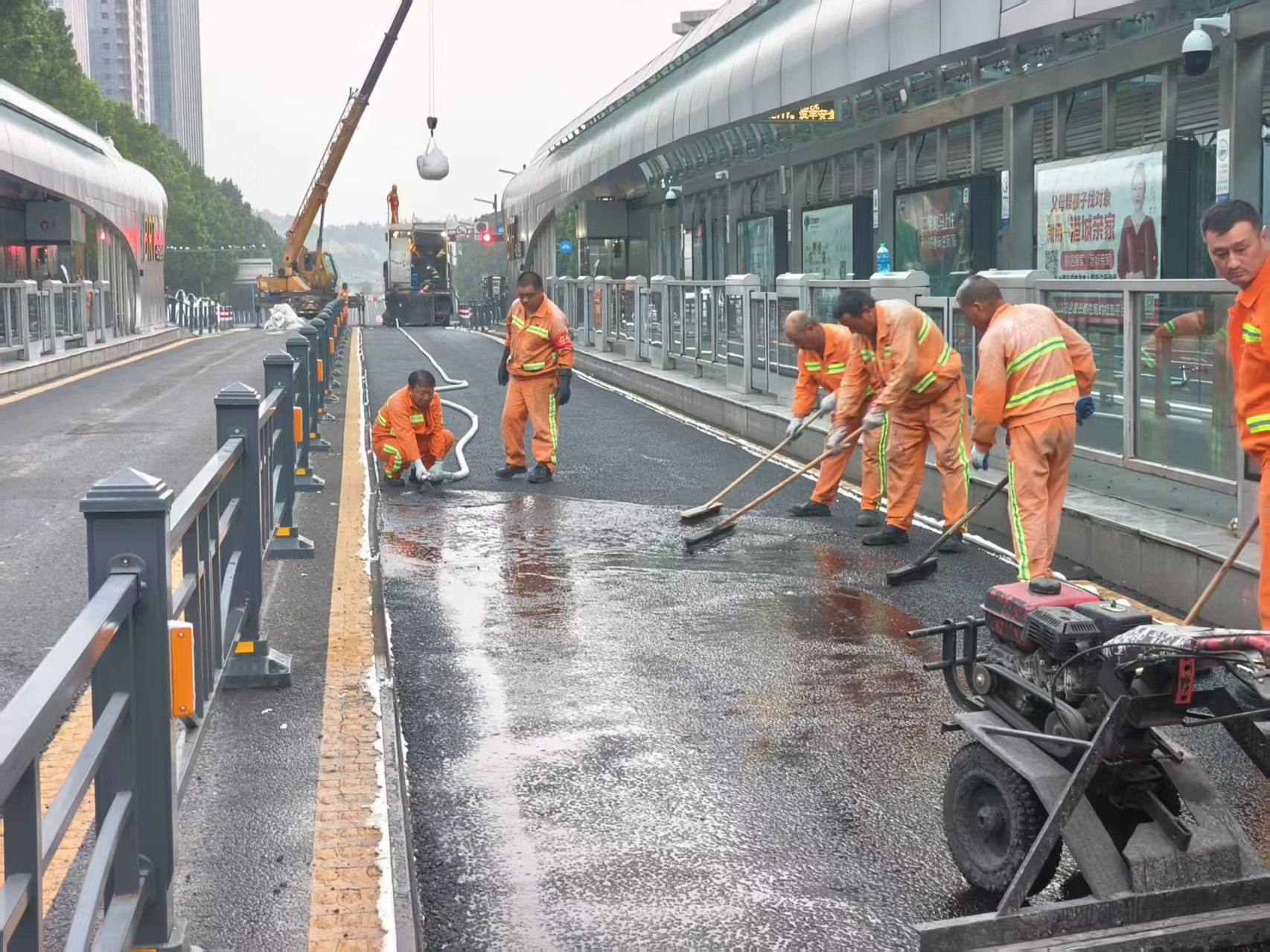 在港城BRT公交站臺專(zhuān)用車(chē)道養護項目中,董入龍創(chuàng )新工作室再次扛起“創(chuàng )新大旗”。公司管養的84個(gè)BRT公交站臺60米范圍專(zhuān)用車(chē)道,因客流量大、車(chē)輛??款l繁,路面車(chē)轍病害嚴重,傳統養護難以兼顧效率與質(zhì)量。工作室成員共同研判后,選取人流密集的一四九站、墟溝購物中心站及西園路站作為試點(diǎn),引入“灌注式半柔性路面技術(shù)”。為確保技術(shù)落地,董入龍帶領(lǐng)團隊開(kāi)展20余次模擬試驗,精準把控材料攤鋪厚度、壓實(shí)溫度等核心參數;施工期間,他創(chuàng )新采用“分段作業(yè) + 錯峰施工”模式,協(xié)調公交部門(mén)調整臨時(shí)??奎c(diǎn),最終僅用72小時(shí)便完成3個(gè)站臺專(zhuān)用車(chē)道的病害整治。經(jīng)后期跟蹤觀(guān)測,試點(diǎn)路段路面平整度、抗滑性能均達到優(yōu)質(zhì)標準。