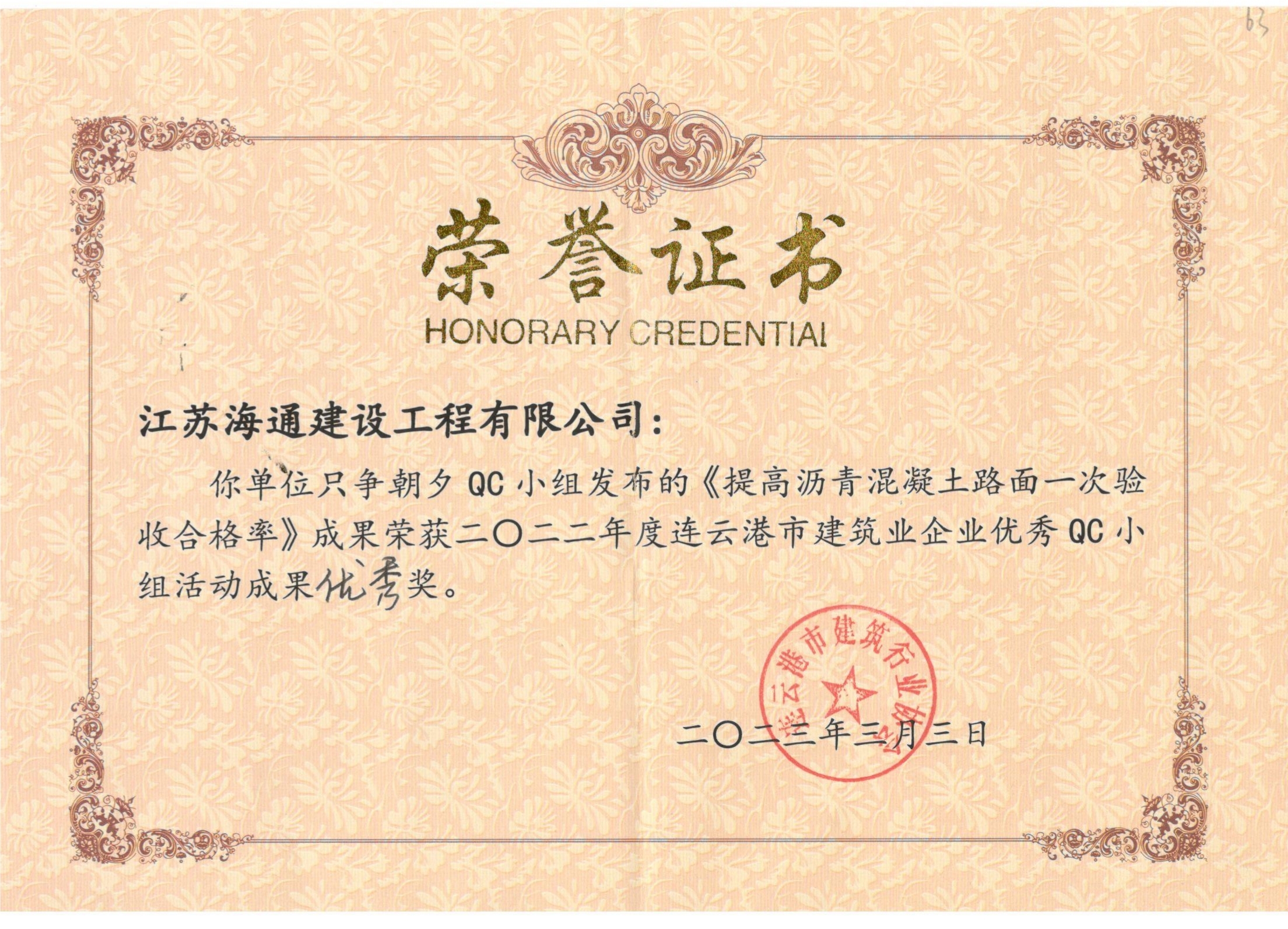 一路有你QC小組《提高瀝青混凝土路面壓實(shí)度合格率》榮獲優(yōu)秀QC小組活動(dòng)成果三等獎,只爭朝夕QC小組的成果《提高瀝青混凝土路面一次驗收合格率》榮獲優(yōu)秀QC小組活動(dòng)成果優(yōu)秀等獎。