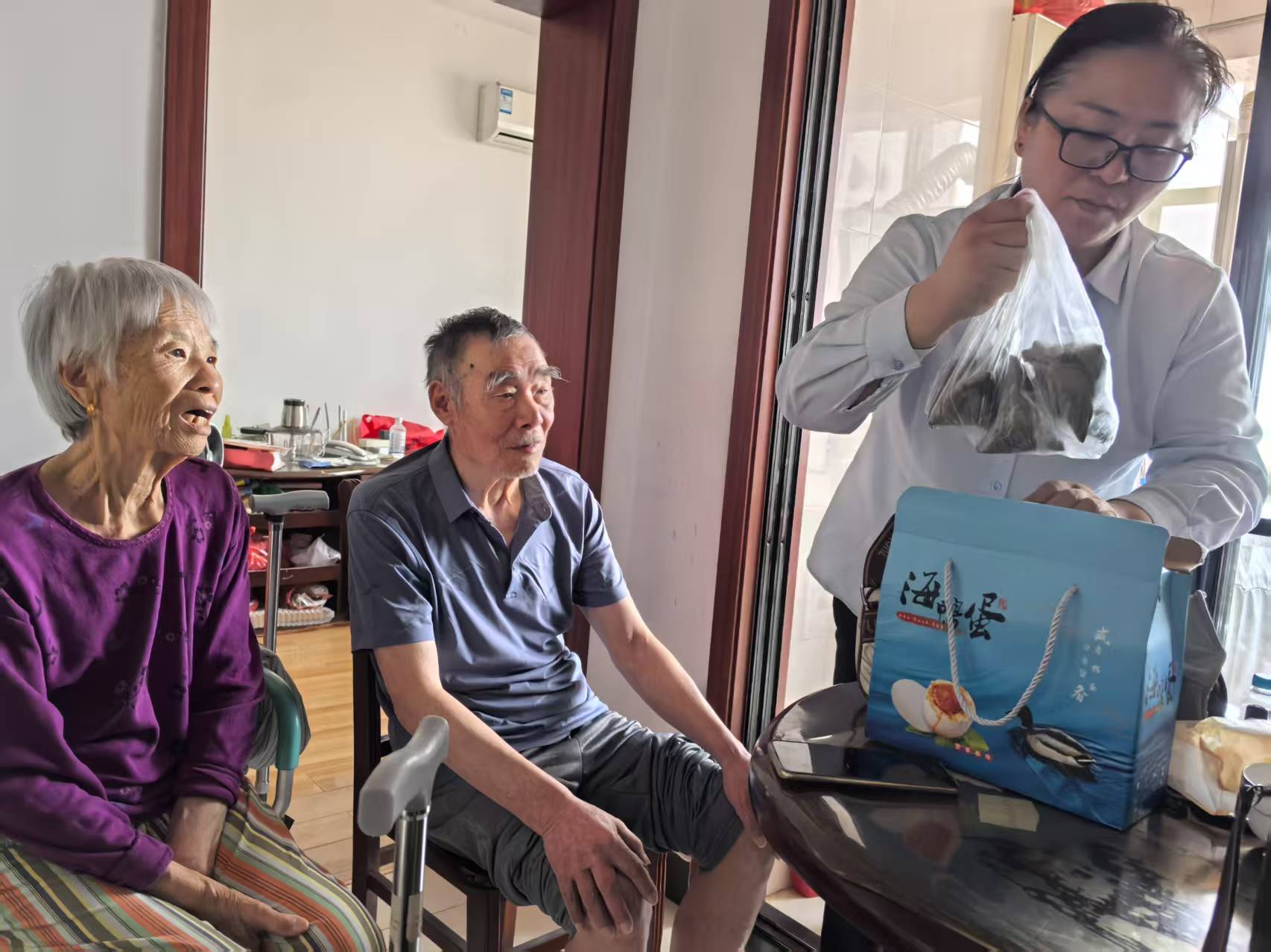 志愿者們?yōu)槔先藴蕚淞讼闾鸬聂兆雍拖滔愕镍喌?,并與老人們拉家常、問(wèn)冷暖,仔細詢(xún)問(wèn)他們的生活近況,耐心傾聽(tīng)老人的心聲,并叮囑他們保重身體。接過(guò)禮物的老人們臉上洋溢著(zhù)幸福的笑容,連連感謝志愿者們的暖心之舉。小小的粽子和鴨蛋,不僅傳遞著(zhù)傳統節日的氛圍,更承載著(zhù)連云港公交對空巢老人的深切關(guān)愛(ài)與牽掛。