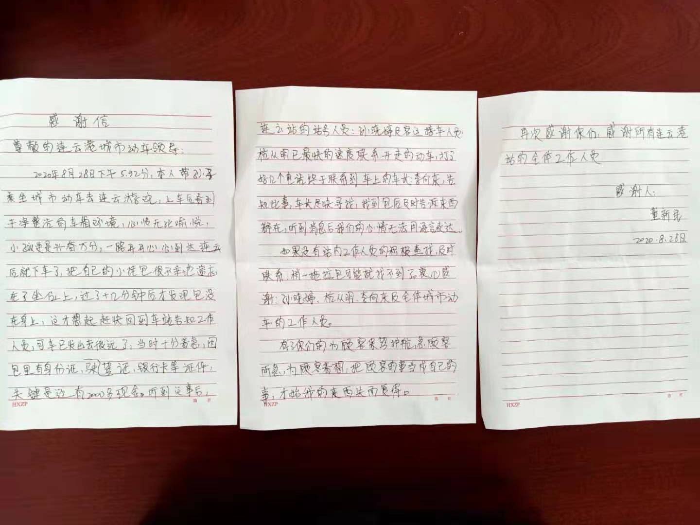 8月28日下午,一位大爺帶著(zhù)孫子乘坐城市動(dòng)車(chē)去連云景區游玩。新穎獨特、舒適整潔的車(chē)廂一下吸引了小朋友的注意力,小朋友興奮萬(wàn)分,大爺也感嘆城市的發(fā)展速度并由衷的高興,以至于到達連云站下車(chē)時(shí),把小掛包丟在了車(chē)上。過(guò)了十幾分鐘后,才發(fā)現包沒(méi)在身上,大爺立馬趕回車(chē)站向工作人員尋求幫助??墒钱敃r(shí)車(chē)已經(jīng)發(fā)車(chē)走了,大爺十分著(zhù)急,因為包里有身份證、駕駛證、銀行卡等重要證件,還有2000多元現金。得知情況后,連云站值班站長(cháng)孫曉婷及客運接車(chē)人員杭從明緊忙聯(lián)系當班列車(chē)長(cháng)李向東。得知此事后,列車(chē)長(cháng)立馬尋找掛包,座椅的邊邊角角都找了一遍,果然在后排座位上找到了掛包。他立刻聯(lián)系站務(wù)員告知包已經(jīng)找到,聽(tīng)到這個(gè)好消息后,大爺懸著(zhù)的心終于落地了,高興地說(shuō)“謝謝你們所有工作人員,如果不是你們的熱心幫助,我的包也不會(huì )在這么短的時(shí)間內找到!”站務(wù)員及客運接車(chē)員連忙回道:“這都是我們應該做的,能幫助到您是我們最大的快樂(lè )?!?/span>