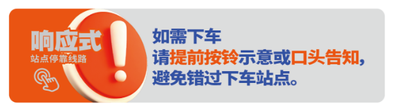 “響應式公交”是指線(xiàn)路不再執行“逢站必?!?,車(chē)輛到站前,要下車(chē)的乘客需提前按鈴示意或口頭告知駕駛員。如無(wú)乘客按鈴或口頭告知下車(chē),并且??空緝葻o(wú)乘客等候、無(wú)其他公交車(chē)??繒r(shí),將減速越站通過(guò)。