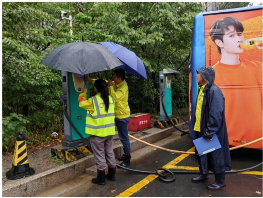巡查人員重點(diǎn)對黨校、西門(mén)等無(wú)雨棚覆蓋或地勢低洼的充電站內設備進(jìn)行檢查。巡檢人員逐一排查充電樁外殼是否完好無(wú)損,充電槍及連接線(xiàn)纜是否存在老化、開(kāi)裂現象,確保電氣連接可靠、防水密封性能達標。針對場(chǎng)站環(huán)境,著(zhù)重疏通排水溝渠,清理雨水井內雜物,并對周邊樹(shù)木、設施進(jìn)行排查加固,防范大風(fēng)、積水可能帶來(lái)的次生災害。同步檢查消防器材的有效性及監控系統的運行穩定性,確保應急響應機制運轉順暢,處置能力可靠。