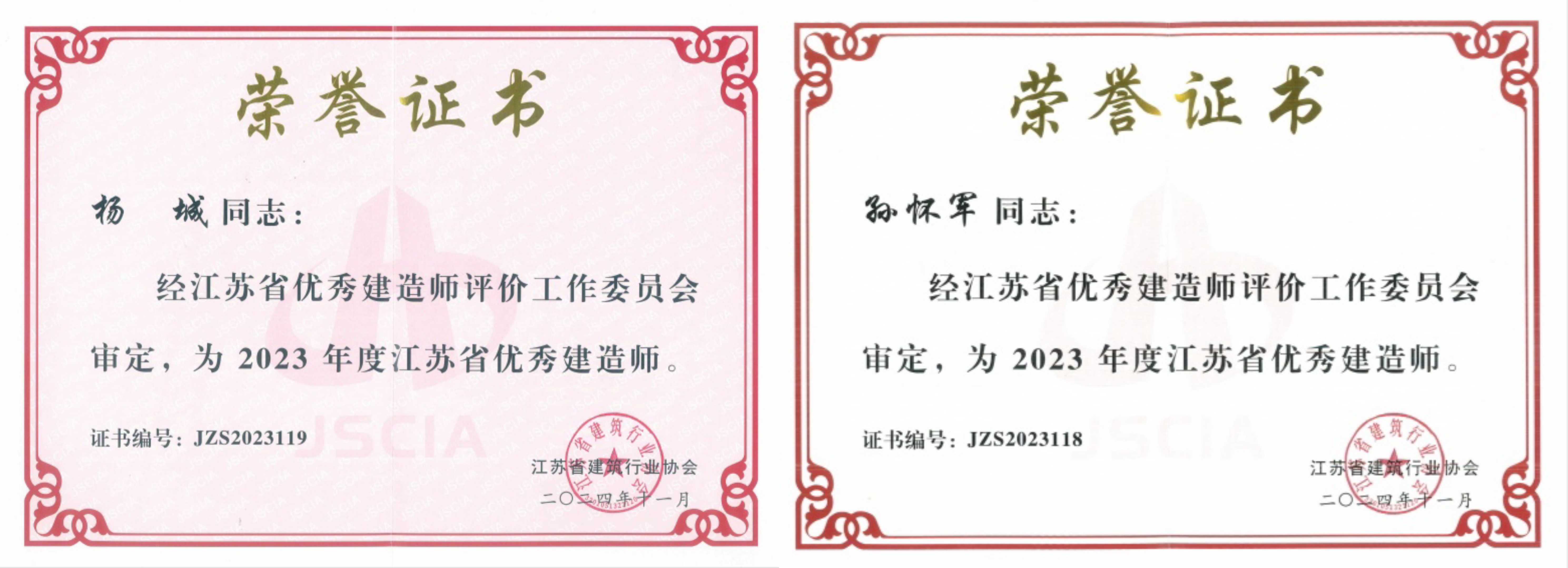 近日,江蘇省建筑行業(yè)協(xié)會(huì )發(fā)布蘇建協(xié)〔2024〕49號文件《關(guān)于發(fā)布2023年度江蘇省優(yōu)秀建造師、江蘇省建筑業(yè)企業(yè)優(yōu)秀項目經(jīng)理評價(jià)結果的決定》,江蘇海建公司楊城、孫懷軍榮獲2023年度“江蘇省優(yōu)秀建造師”稱(chēng)號。