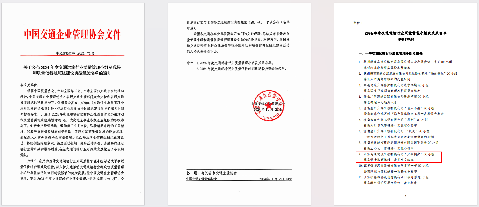 近日,據中交企協(xié)質(zhì)字〔2024〕74號文《關(guān)于公布2024年度交通運輸行業(yè)質(zhì)量管理小組及成果和質(zhì)量信得過(guò)班組建設典型經(jīng)驗名單的通知》,江蘇海建公司只爭朝夕QC小組及其成果《提高瀝青路面攤鋪一次成型合格率》被評為2024年度交通運輸行業(yè)質(zhì)量管理小組及成果一等獎。