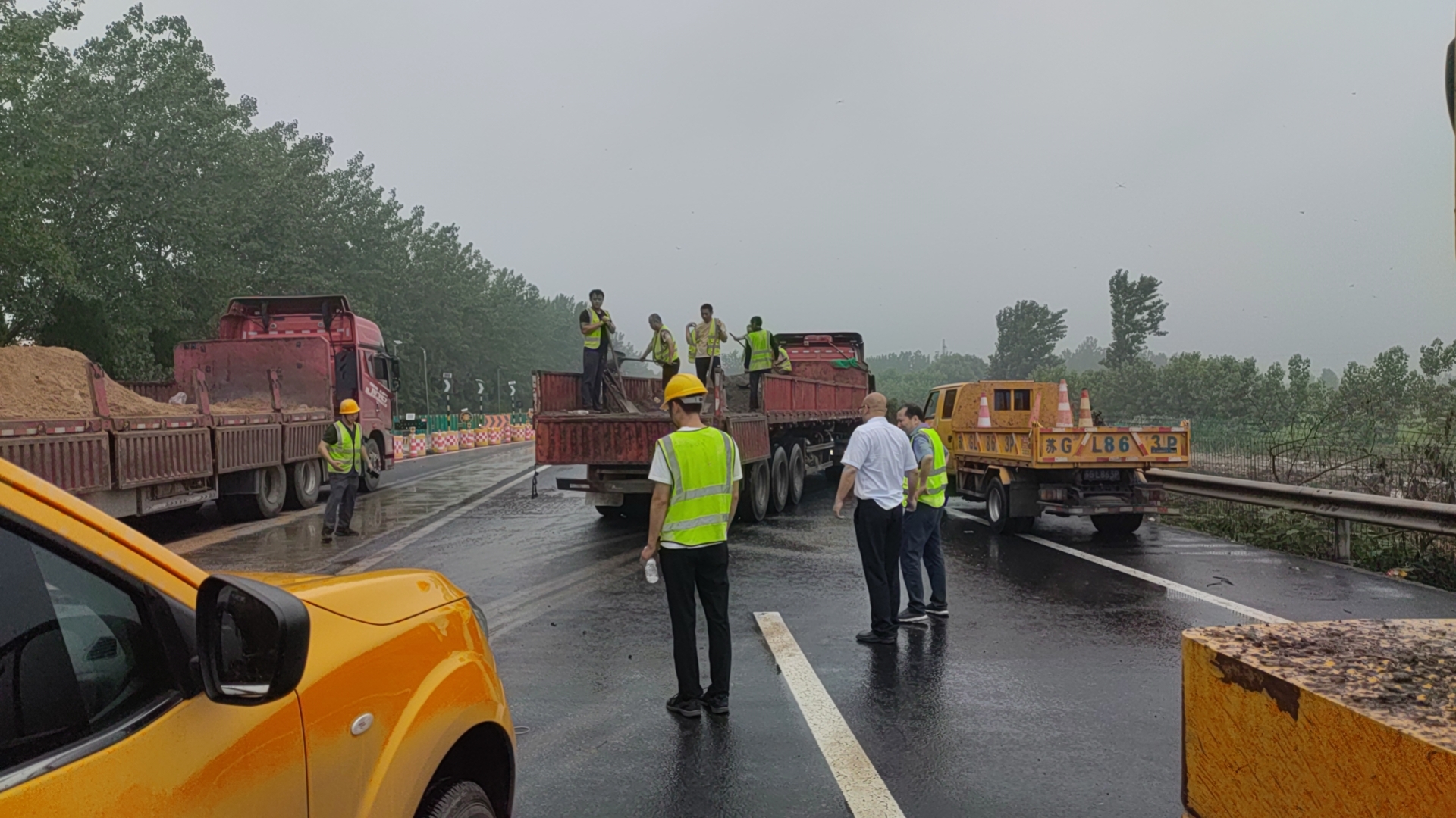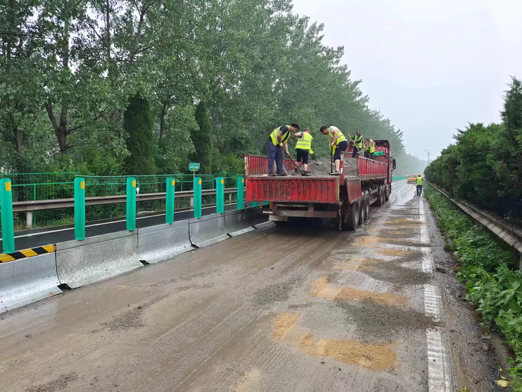 豐達公司寧連高速D標項目部接到上級電話(huà)通知,立即組織應急處置人員與車(chē)輛第一時(shí)間到達現場(chǎng)清理。項目部組織應急隊伍32人,工程車(chē)輛12輛趕赴現場(chǎng),迅速開(kāi)展現場(chǎng)清理、沙石吸附、清掃推灰。直至10:26分,經(jīng)施工人員多方努力,路面油污終于清理干凈,受污染路面消除了安全隱患,道路恢復了暢通。