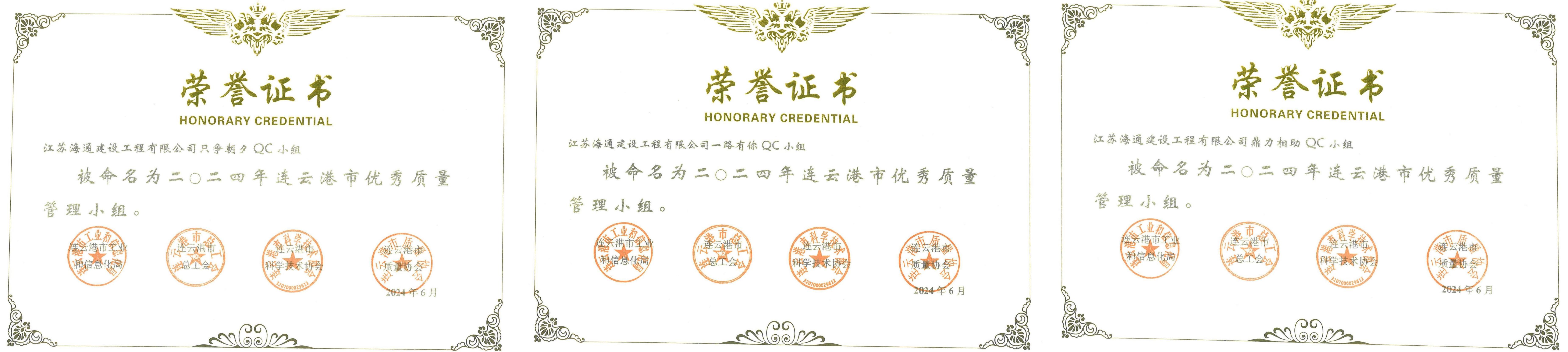 近日,據連工信發(fā)〔2024〕76號文《關(guān)于表彰2024年連云港市優(yōu)秀質(zhì)量管理小組、質(zhì)量信得過(guò)班組、優(yōu)秀企業(yè)、卓越領(lǐng)導者、優(yōu)秀推進(jìn)者的通知》,江蘇海建公司只爭朝夕QC小組、一路有你QC小組、鼎力相助QC小組榮獲2024年連云港市優(yōu)秀質(zhì)量管理小組。