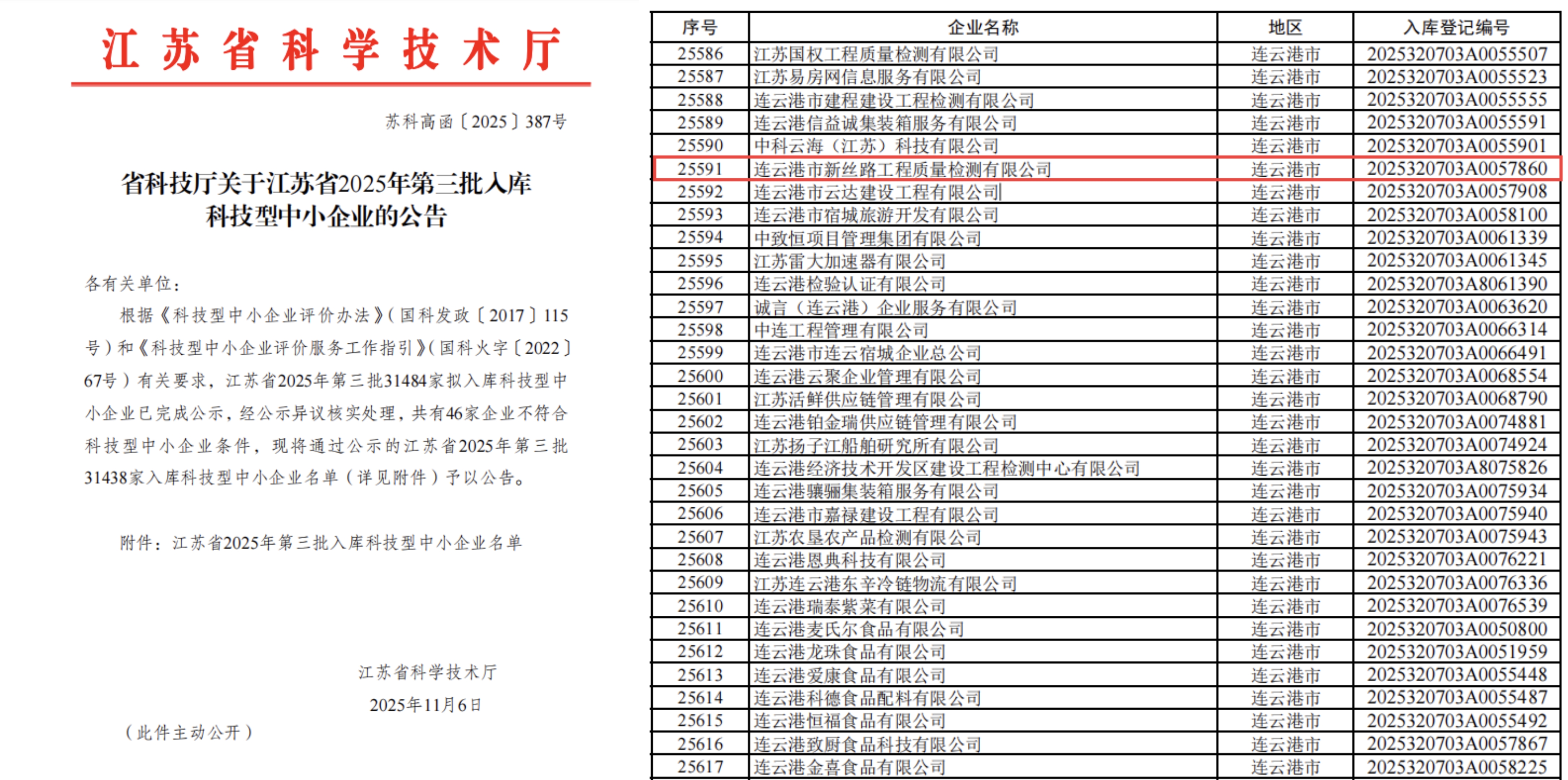近日,江蘇省科學(xué)技術(shù)廳公布2025年第三批科技型中小企業(yè)入庫名單,江蘇海建新絲路工程質(zhì)量檢測有限公司憑借其扎實(shí)的技術(shù)實(shí)力和持續的創(chuàng )新能力成功入選,正式獲得江蘇省科技型中小企業(yè)認證。