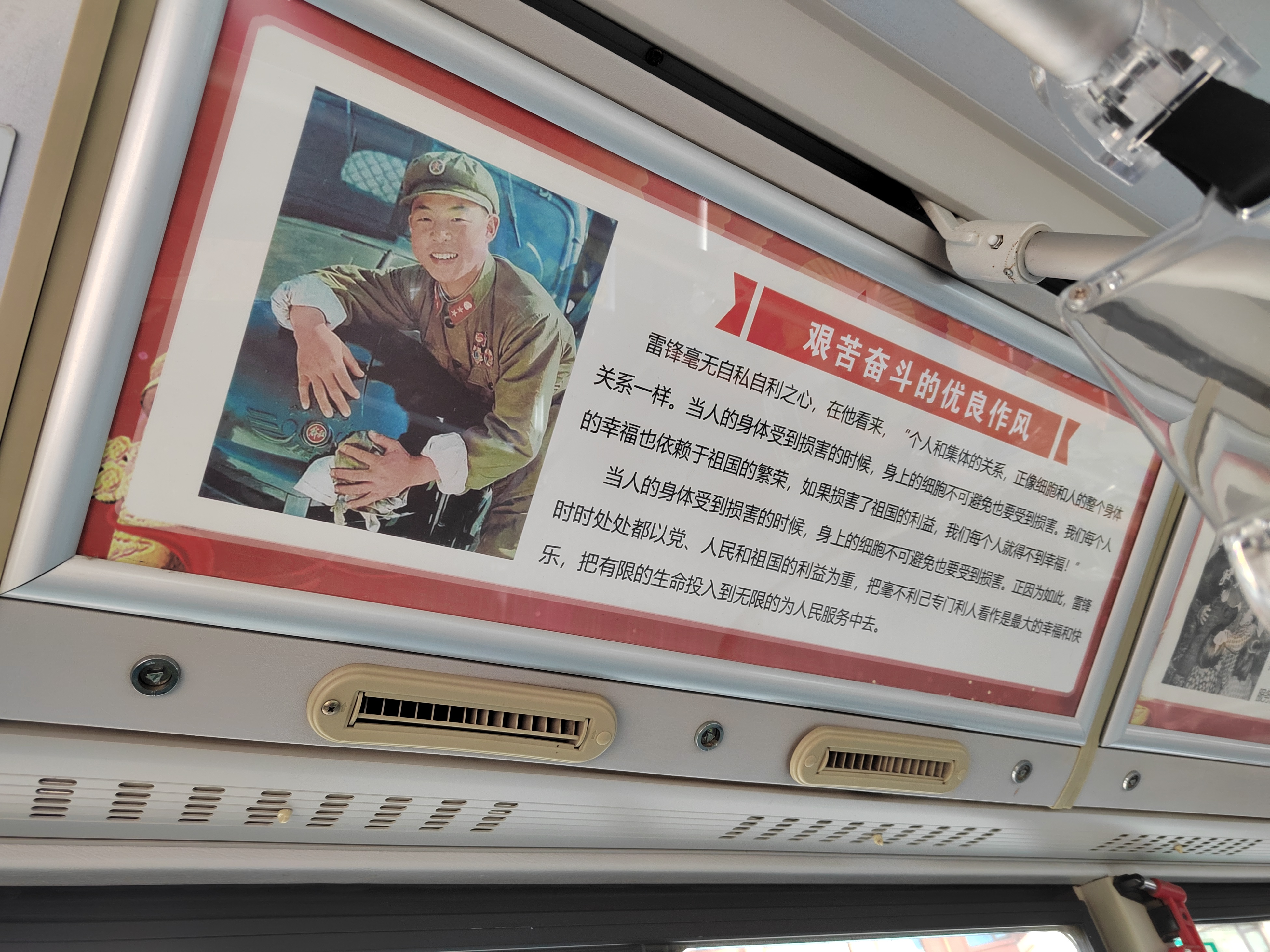 31路公交線(xiàn)全程22個(gè)站點(diǎn),途經(jīng)連云區主城區、海濱大道,道路情況復雜,上下坡道較多,乘客大多數為海濱大道周邊及連云古鎮居住的老年人。第60個(gè)學(xué)雷鋒紀念日即將到來(lái),公交集團公交事業(yè)二部精心裝扮31GK8832公交車(chē)學(xué)雷鋒主題公交車(chē)。車(chē)廂外部以“學(xué)習雷鋒精神 弘揚雷鋒精神 爭做時(shí)代先鋒”為主題詞;車(chē)廂內部從“共產(chǎn)主義戰士 最美奮斗者”“艱苦奮斗的優(yōu)良作風(fēng)”“刻苦學(xué)習和鉆研理論”“干一行愛(ài)一行鉆一行”四大方面宣傳、介紹雷鋒先進(jìn)事跡,弘揚雷鋒精神。乘客進(jìn)站臺前,便能遠遠地感受到濃厚的學(xué)雷鋒氛圍,感受到31“與雷鋒車(chē)同行海濱大道文明線(xiàn)”車(chē)廂里積極向上的紅色底色。