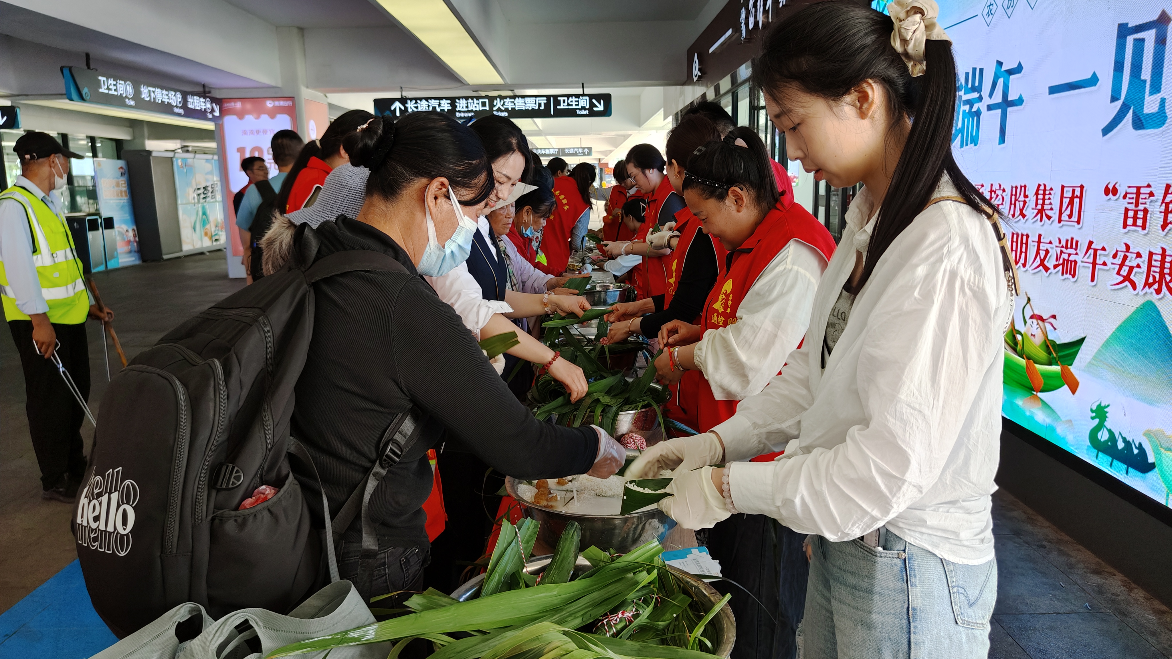 溫情現場(chǎng):指尖技藝傳遞節日暖意。活動(dòng)現場(chǎng),“雷鋒車(chē)”手們身著(zhù)統一志愿紅,在驛站門(mén)前架起“溫情攤位”。翠綠的粽葉在指尖翻飛,雪白的糯米裹入甜蜜餡料,轉眼間化作棱角分明的粽子;艾草與薄荷混合的清香中,繡著(zhù)吉祥紋樣的香包在銀針穿梭間成型?!白D宋绨部?!”“大爺,嘗個(gè)熱乎粽子再趕路!”志愿者們將滿(mǎn)載心意的節日禮物遞到旅客手中,輕聲的祝福讓“雷鋒車(chē)”驛站洋溢著(zhù)家的溫馨。一位收到香包的旅客感慨:“出門(mén)在外收到這樣的禮物,心里暖得像家人在身邊?!?/span>