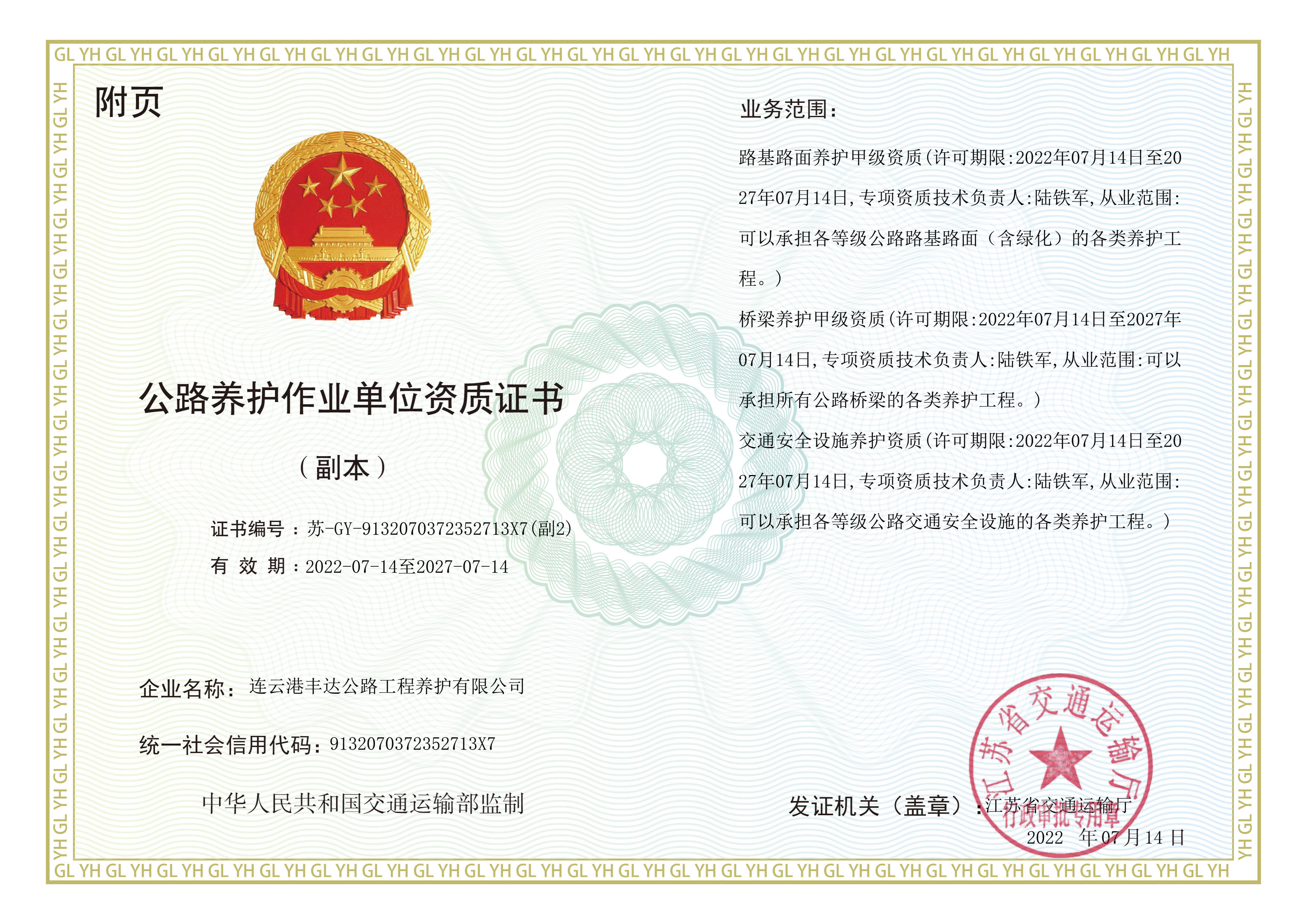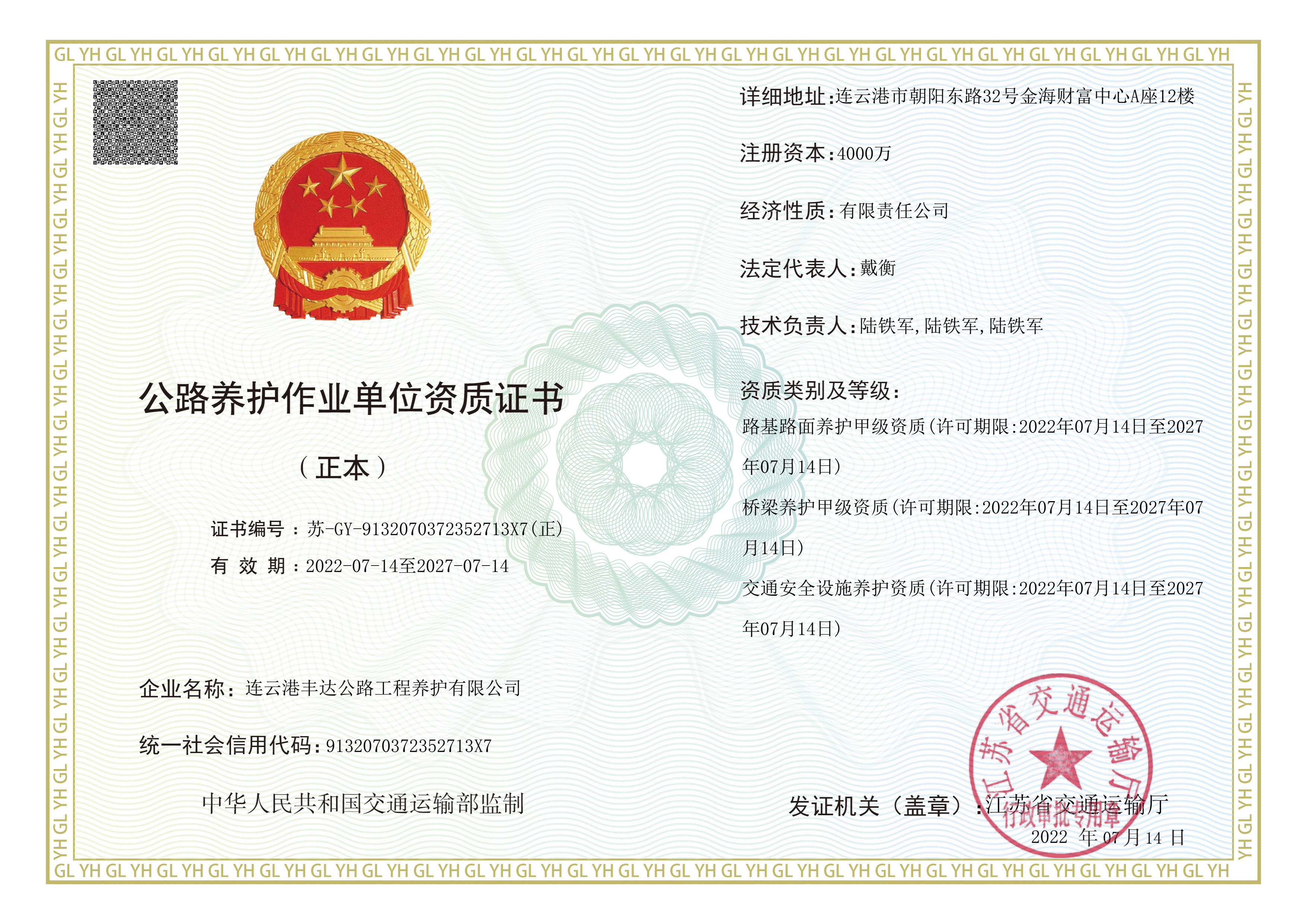 豐達公司公路養護作業(yè)單位路基路面甲級、橋梁甲級、 交通安全設施資質(zhì)申報成功